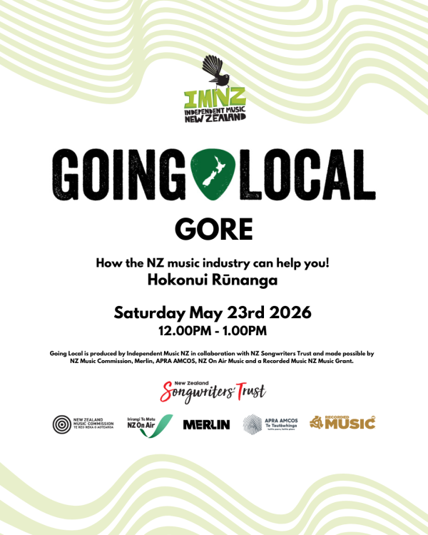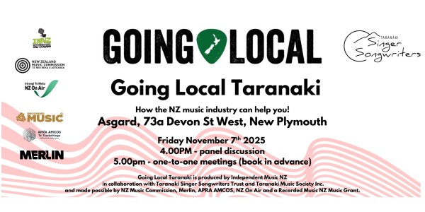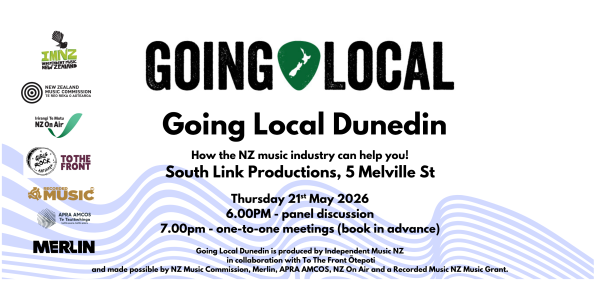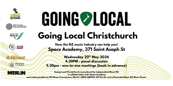 Going Local is produced by Independent Music NZ and made possible by NZ Music Commission, Merlin, APRA AMCOS, NZ On Air and a Recorded Music NZ Music Grant.